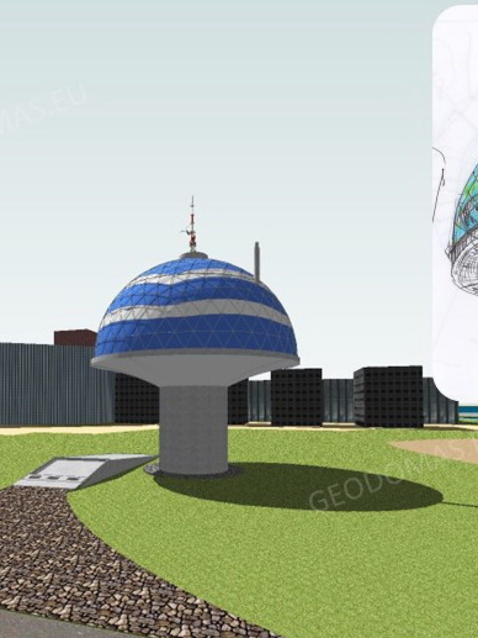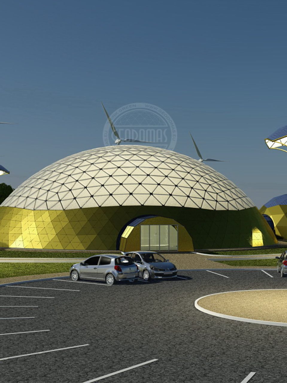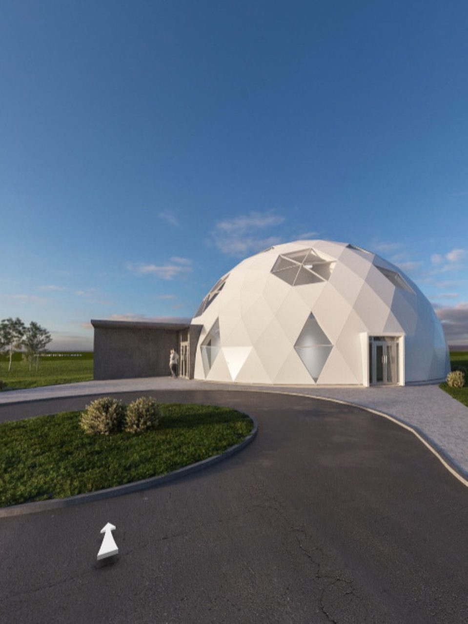 Office building 460m2 is made completely from materials such as steel, polyurea, aliuminium and glass. The 10-meter-high dome covers the entire office with a diameter of Ø20 meters.
