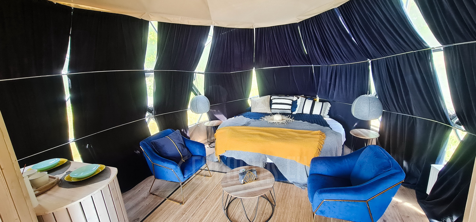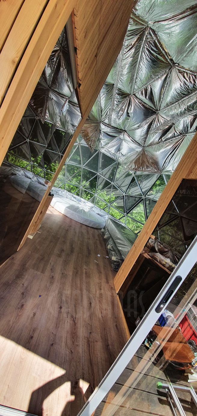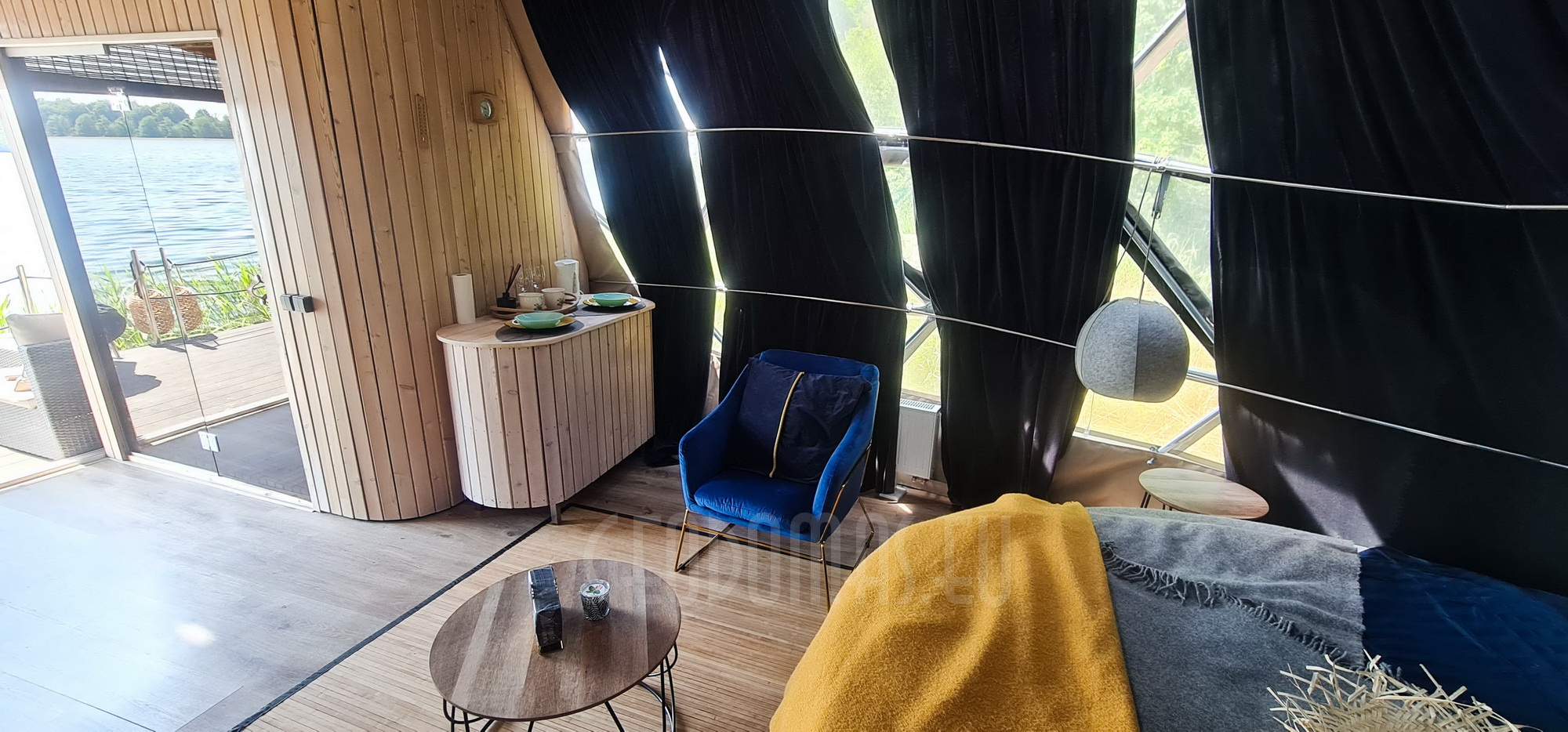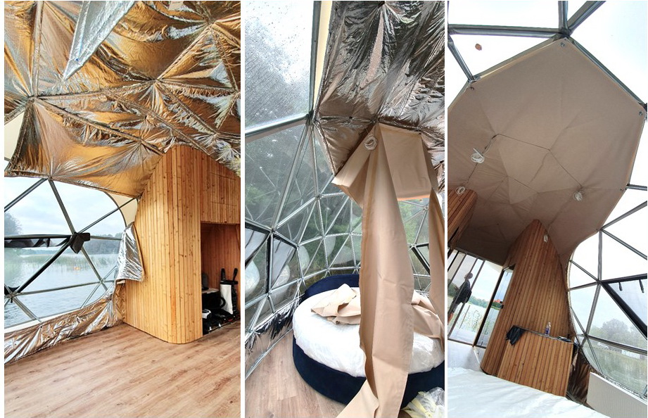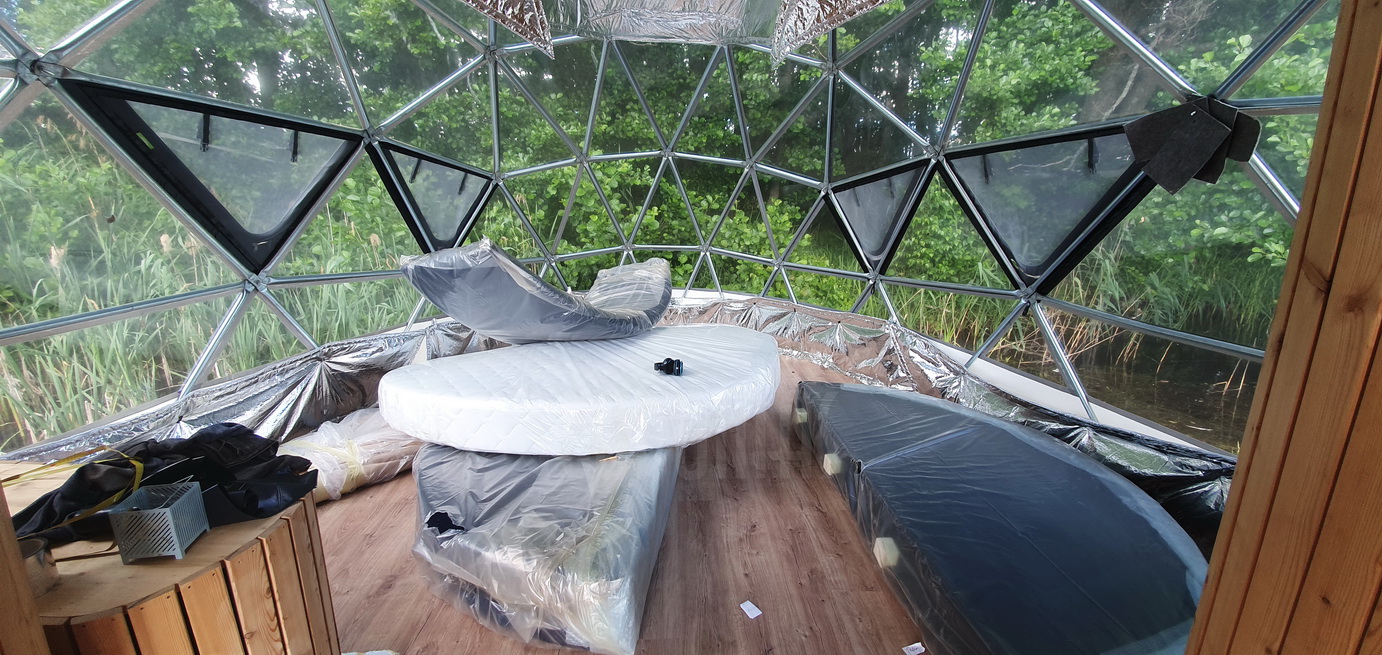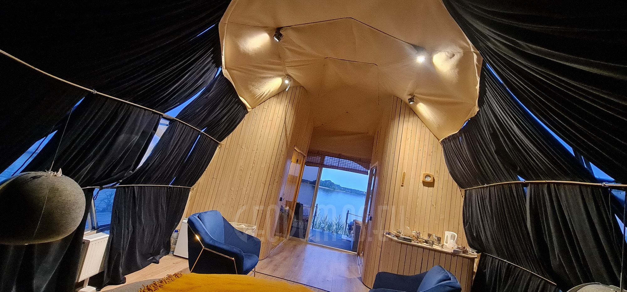 Kupolas ir platforma sukuria estetiškai patrauklią, funkcionalią ir aplinkai draugišką erdvę. Išoriniai elementai harmonizuojasi su aplinka, o viduje naudojamos daugiasluoksnės sienos su tekstile, sukuriant jaukią, saugią ir draugišką aplinką tiek dieną, tiek naktį.