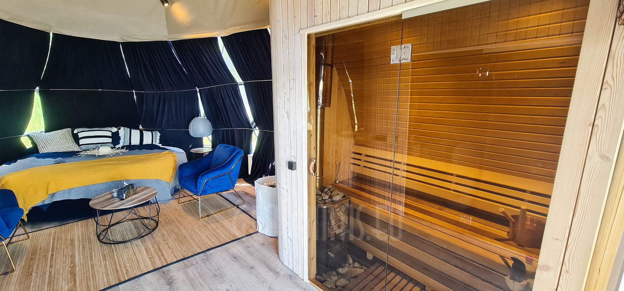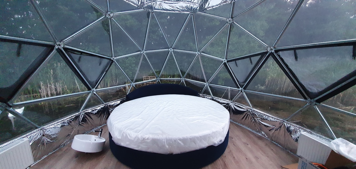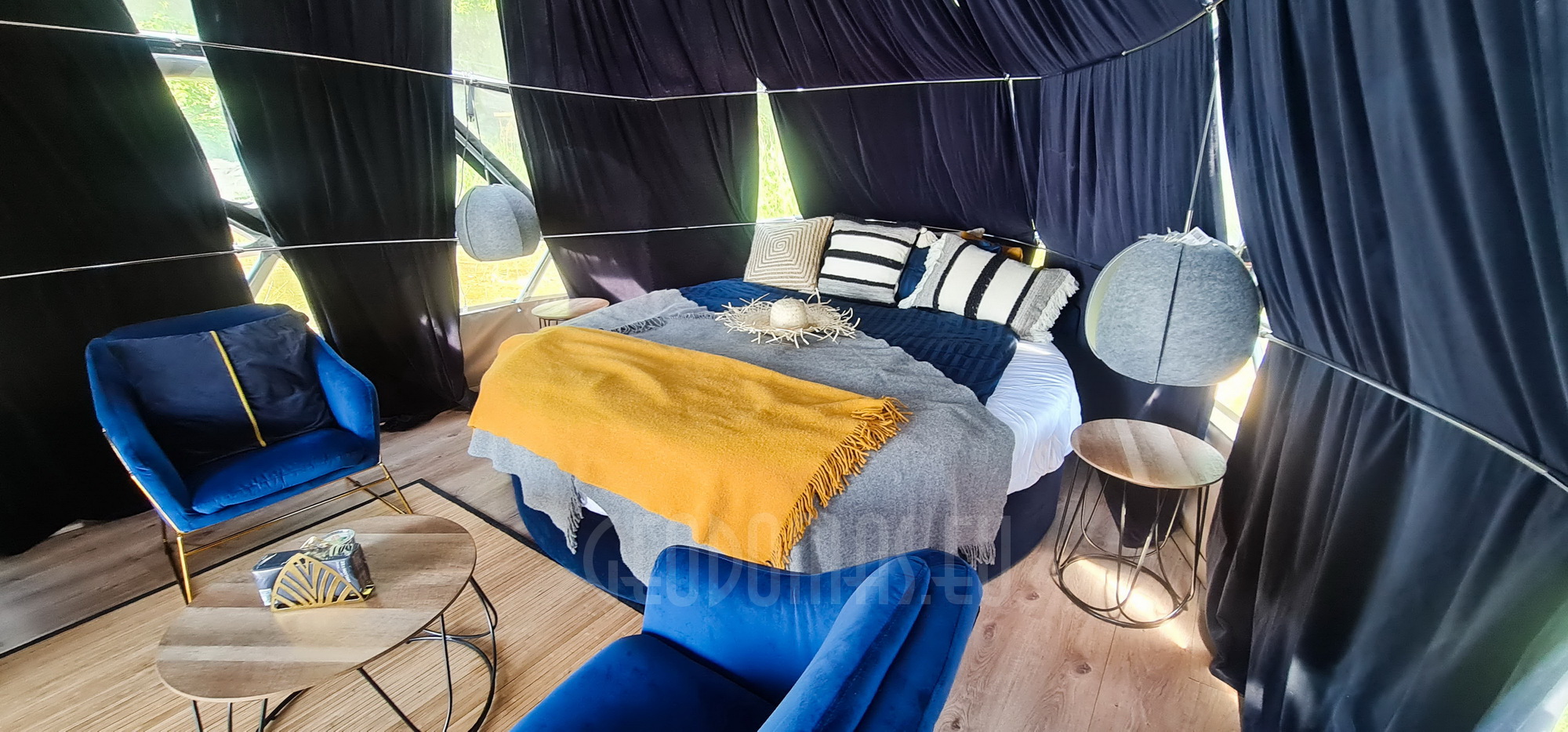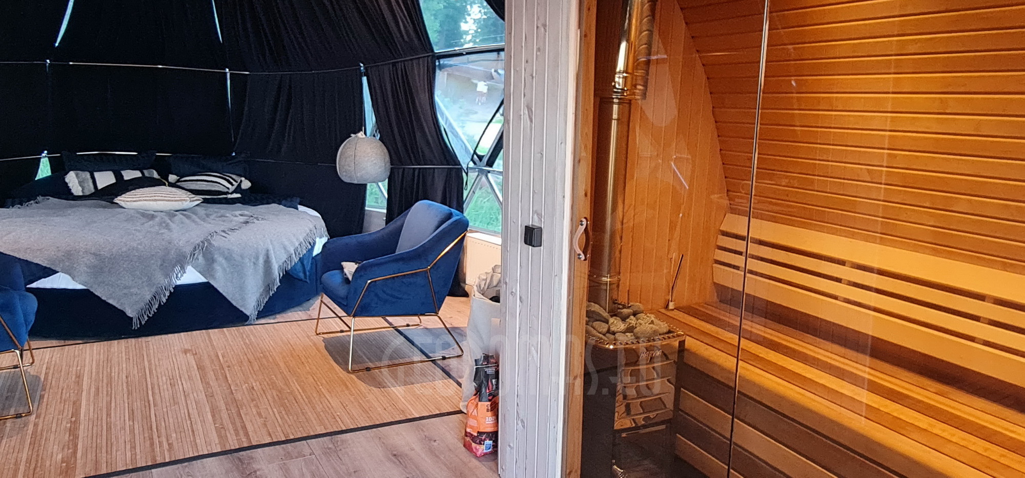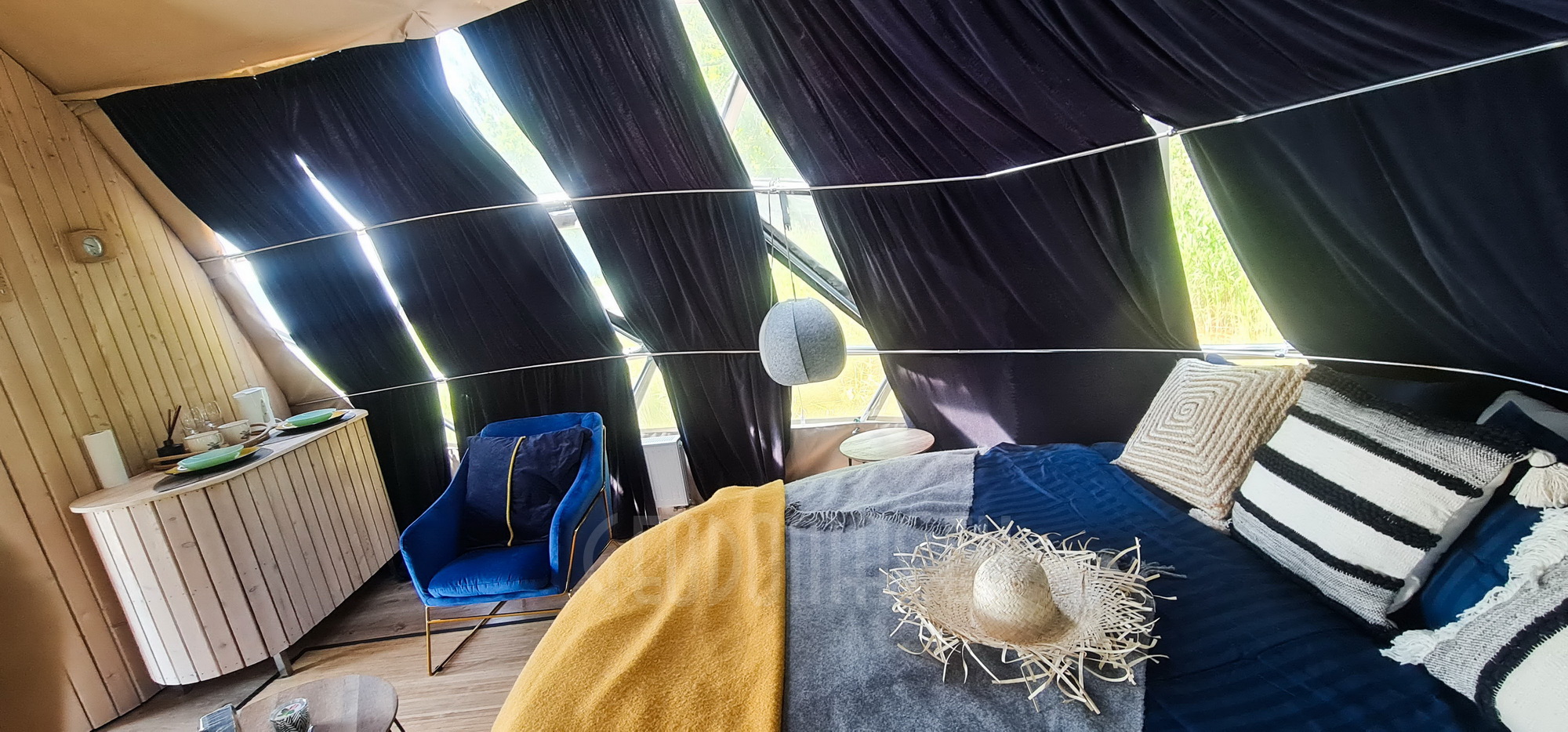 Kupolas ir platforma sukuria estetiškai patrauklią, funkcionalią ir aplinkai draugišką erdvę. Išoriniai elementai harmonizuojasi su aplinka, o viduje naudojamos daugiasluoksnės sienos su tekstile, sukuriant jaukią, saugią ir draugišką aplinką tiek dieną, tiek naktį.