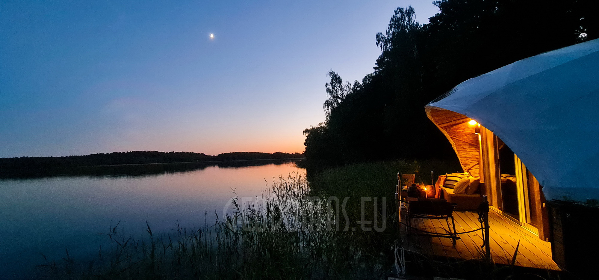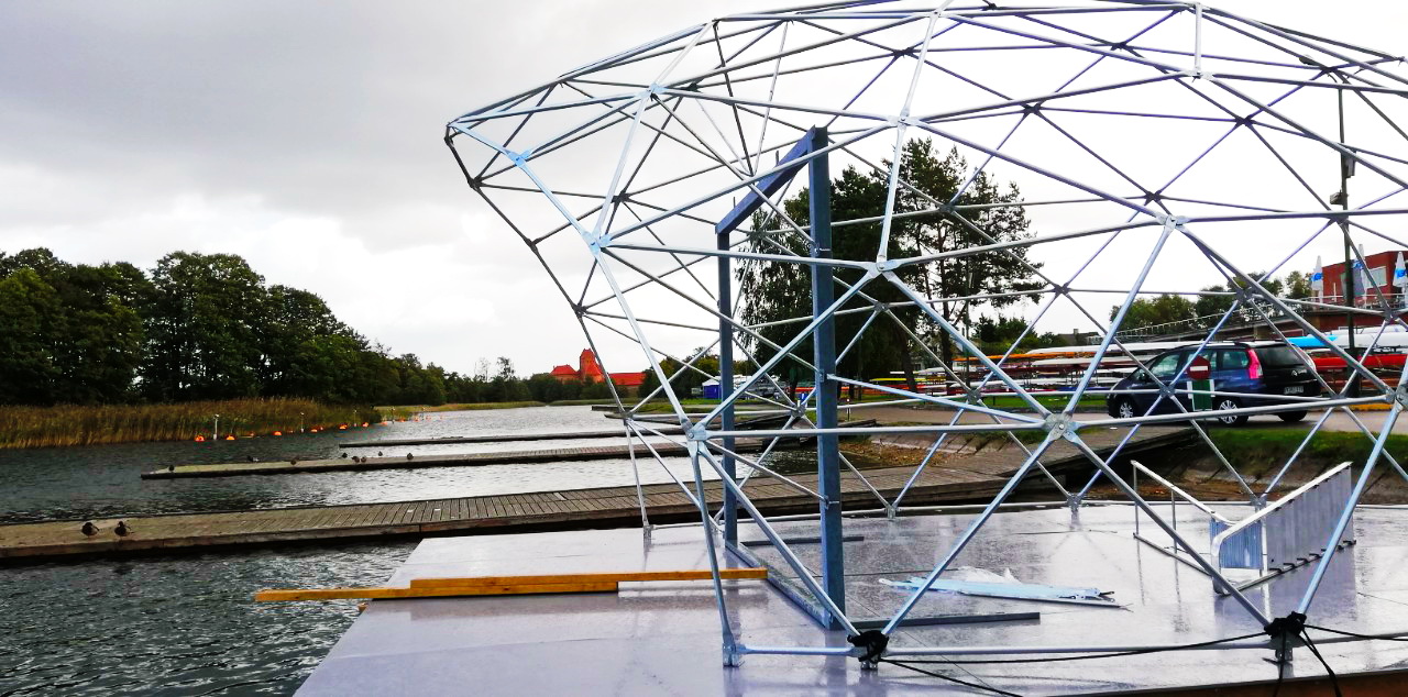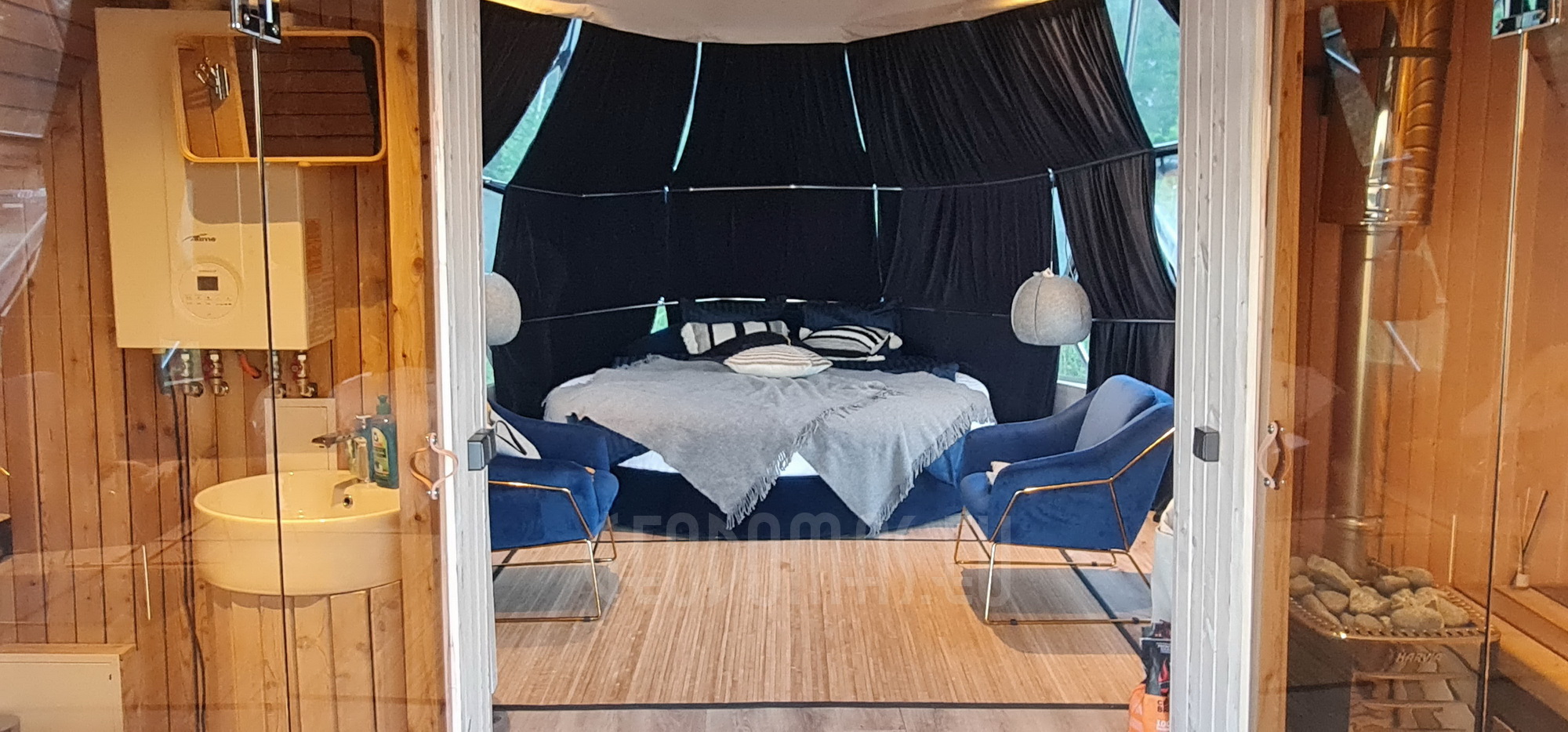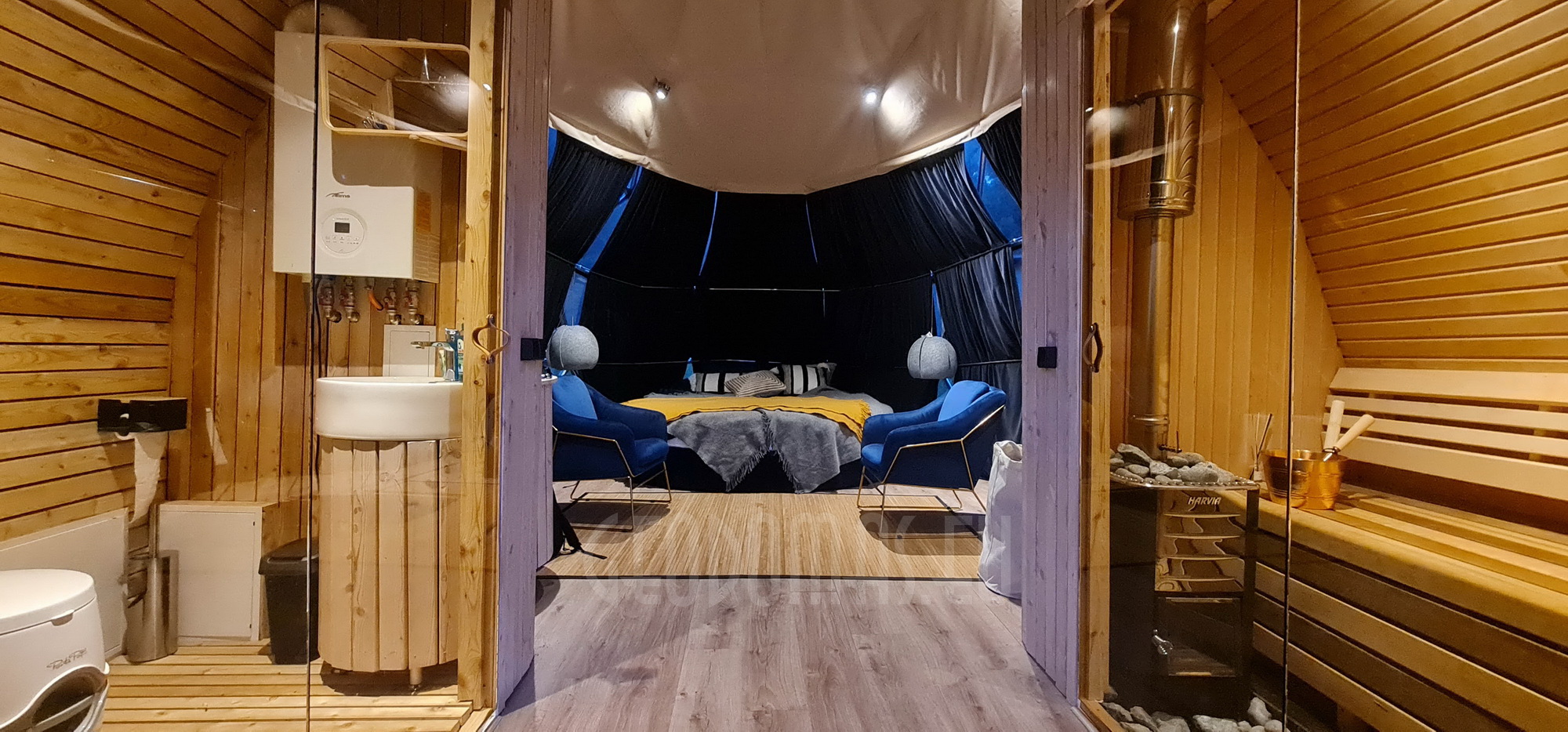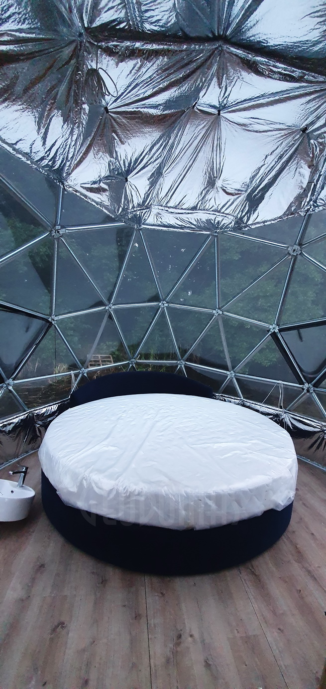 Kupolas ir platforma sukuria estetiškai patrauklią, funkcionalią ir aplinkai draugišką erdvę. Išoriniai elementai harmonizuojasi su aplinka, o viduje naudojamos daugiasluoksnės sienos su tekstile, sukuriant jaukią, saugią ir draugišką aplinką tiek dieną, tiek naktį.