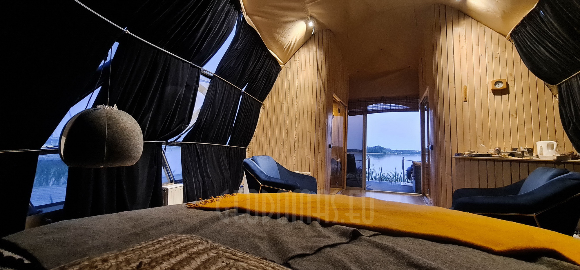 Įsivaizduokite save atsibundantį kupolo formos laive, švelniai siūbuojamame ežero bangų. Ramybė, tyla, o pro skaidrius langus atsiveriantis nuostabus gamtos peizažas. Šis glamping laivas ne tik užtikrina komfortą, bet ir yra modernios inžinerijos stebuklas, apjungiantis gamtos grožį ir pažangiausias technologijas.