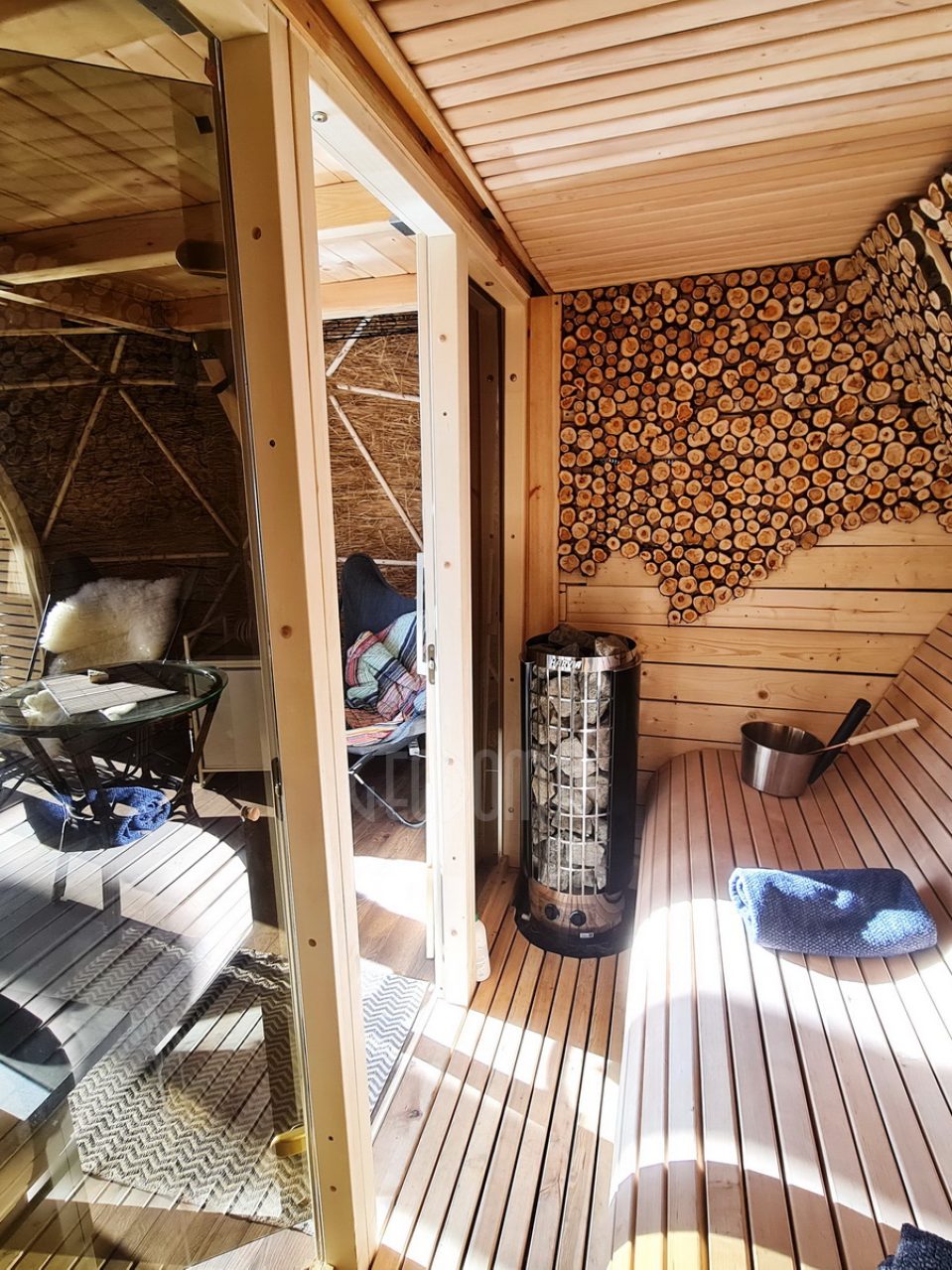 ➖ Žemės kupolas – natūralios spalvos, šiltos medinės tekstūros ir akmens elementai sukuria jaukią atmosferą, primenančią žemės energiją.