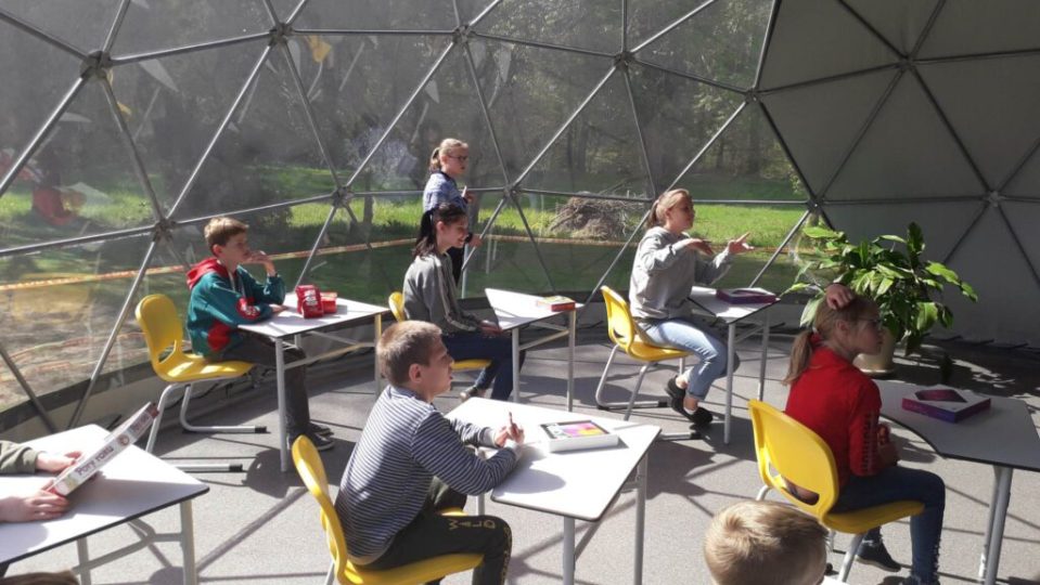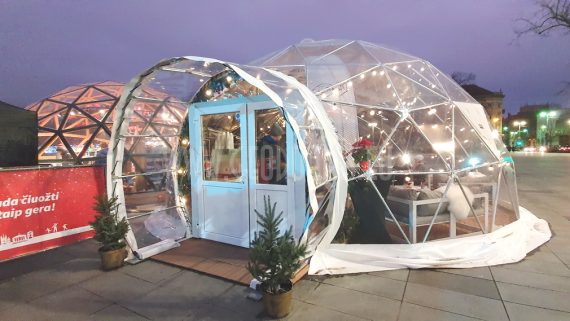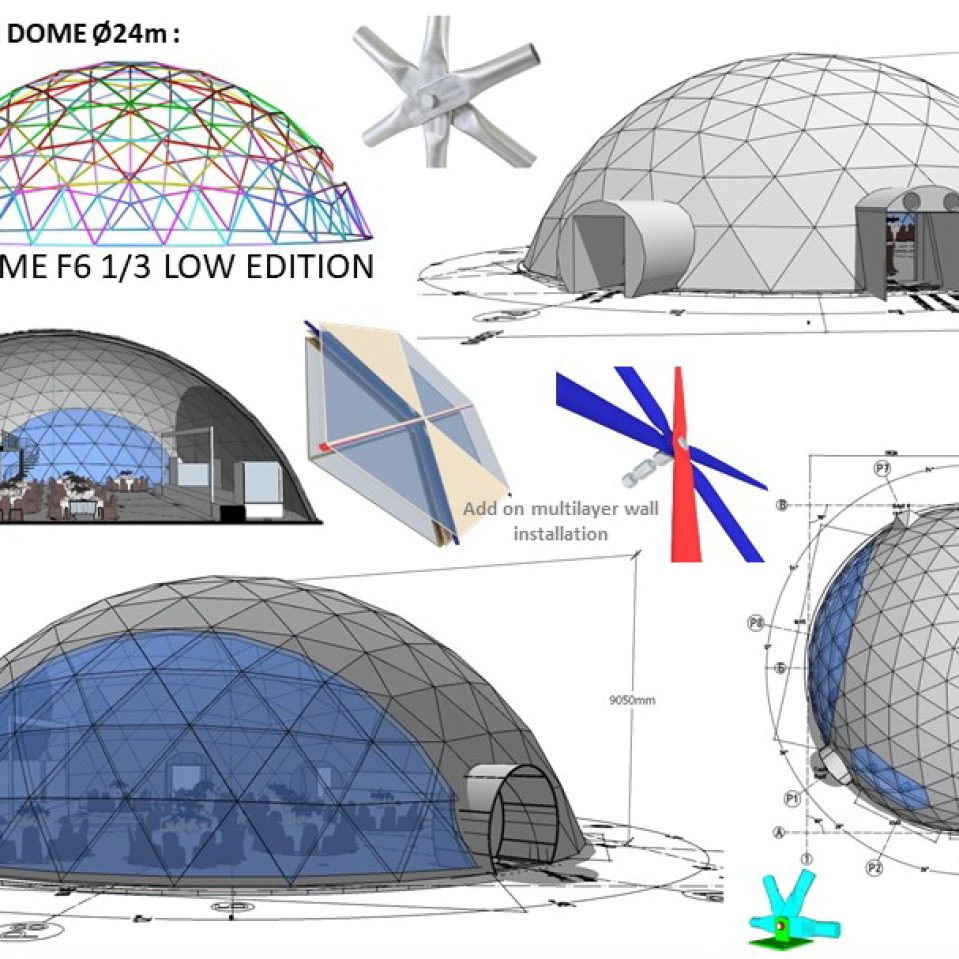Du geodeziniai kupolai – Ø20m ir Ø13m – sujungti į vieningą pokylių erdvę. Jie pastatyti naudojant nerūdijančio plieno konstrukcijas su GEODOMAS “TUBE” sistema. Kupolai uždengti baltu PVC tentu, su permatomais segmentais, leidžiančiais dienos šviesai patekti į vidų, tuo pačiu užtikrinant eleganciją ir šviesos žaismą.