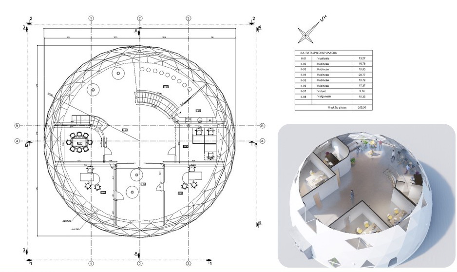 Šis 460m² biurų pastatas simbolizuoja inovacijų ir ekologiškų sprendimų sintezę. Kiekvienas jo elementas, nuo koncepcijos iki realizacijos, buvo kruopščiai apgalvotas, siekiant sukurti ne tik išskirtinio dizaino, bet ir efektyviausią darbo aplinką. Kupolo forma ne tik suteikia estetinį išskirtinumą, bet ir leidžia optimaliai panaudoti erdvę bei natūralią šviesą.