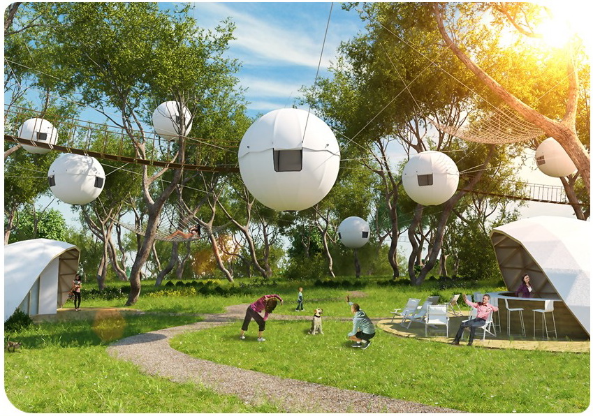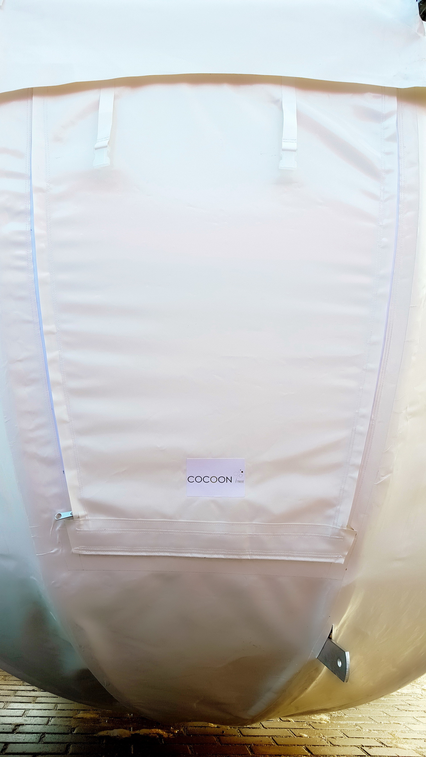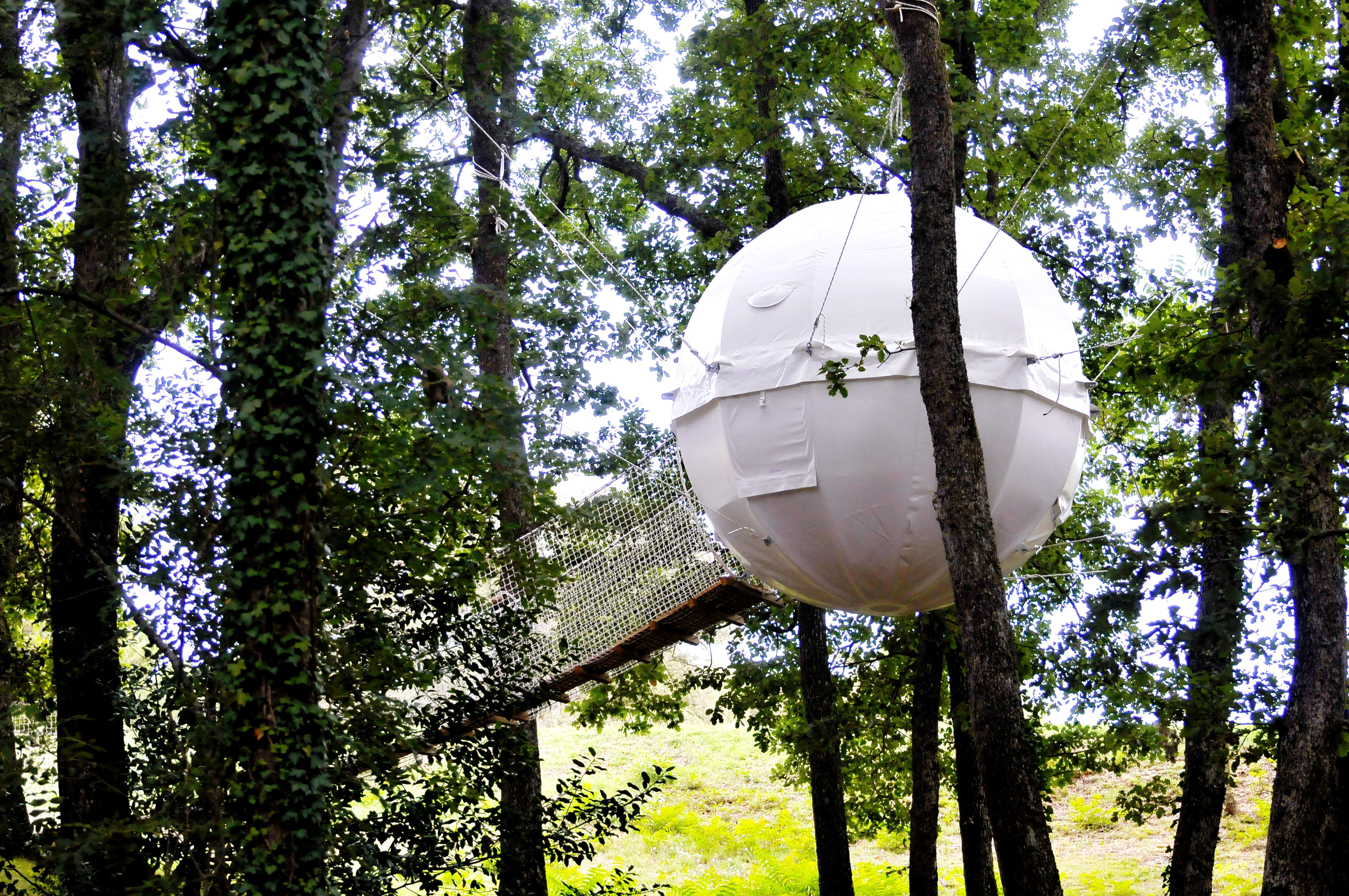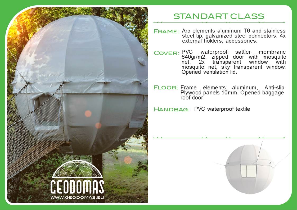 Medžiuose įrengta trijų metrų pločio aliuminio konstrukcijos sfera padengta vėjui ir lietui atspariu audiniu, tai COCOON palapinė. Arti nėra medžių, ne bėda, palapinę įsirengsite ant specialiai sukurto rėmo.