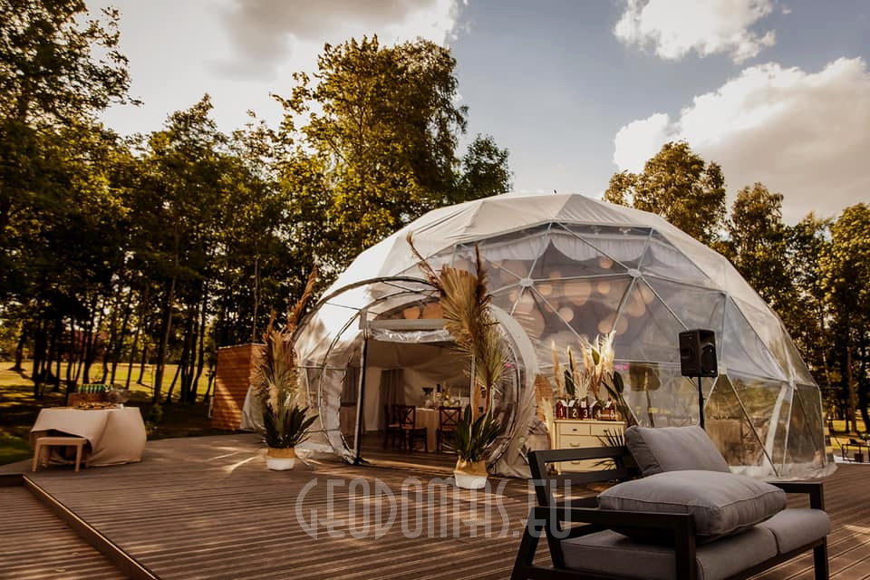 Panoraminė PVC lango membrana tonuota, skirta naudoti „Glamping“ tentui. Skaidrus PVC audinys, puikiai praleidžiantis saulės šviesą ir apšviečiantis visą kupolą..