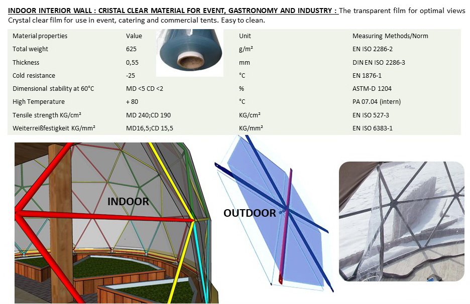 Įtempimo daugiasluoksnė vidaus siena sukuria 15 cm oro kamerą. Ši technologija leidžia izoliuoti jūsų kupolą. Oro erdvė nuolat vėdinama natūralios ventiliacijos srautais. Daugiasluoksnė siena pratęs kupolo sezoną visiems metams. 100% poliesteris su PVC uždangalu, Ypač neplyšantis / tvirtas, atsparus vandeniui, plyšimui sunkusis PVC tentas.