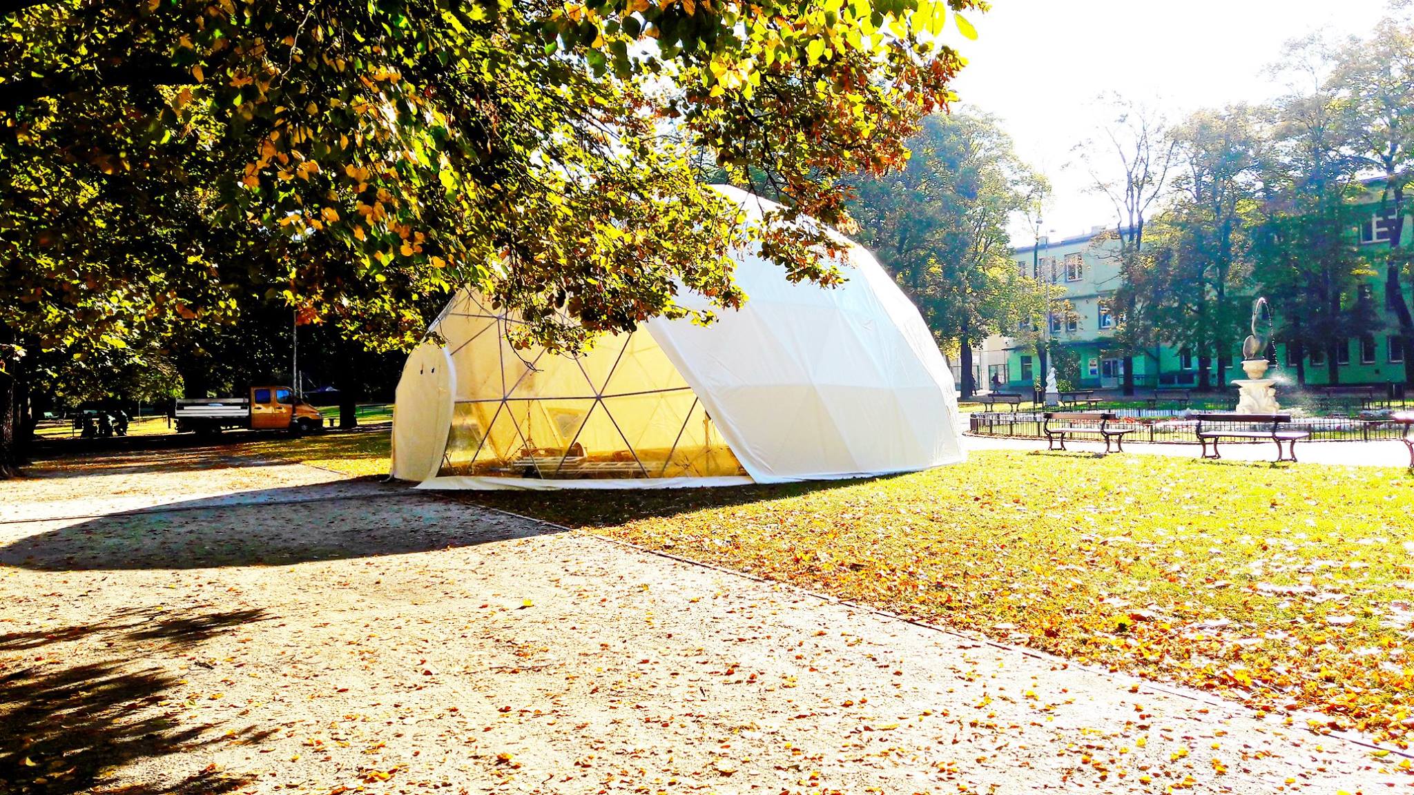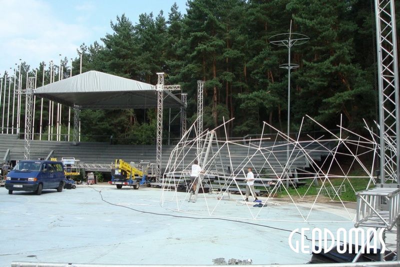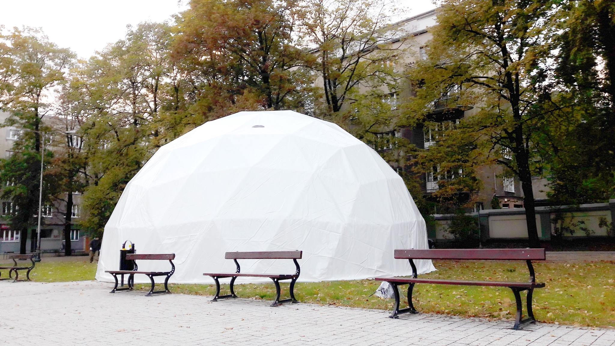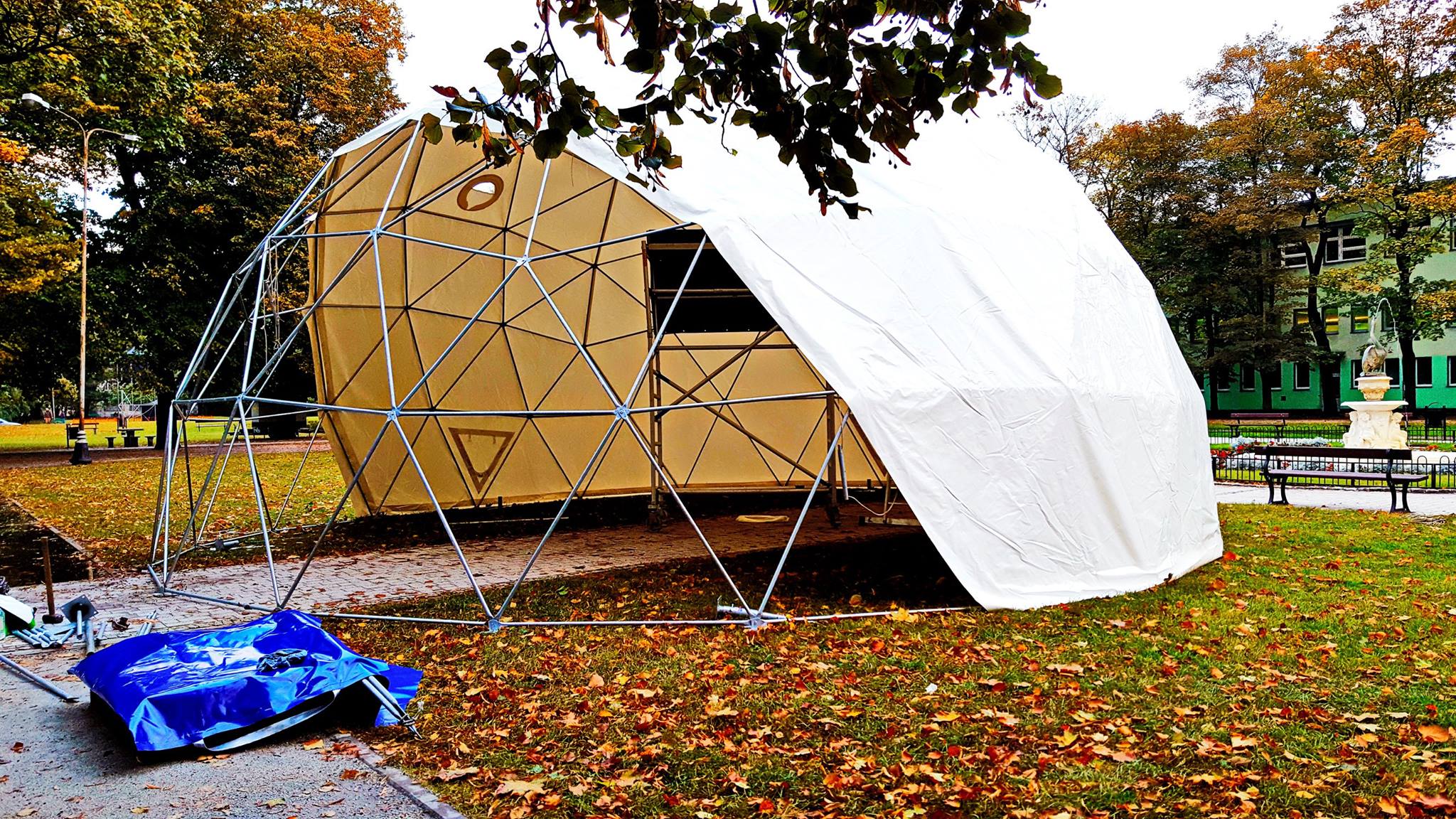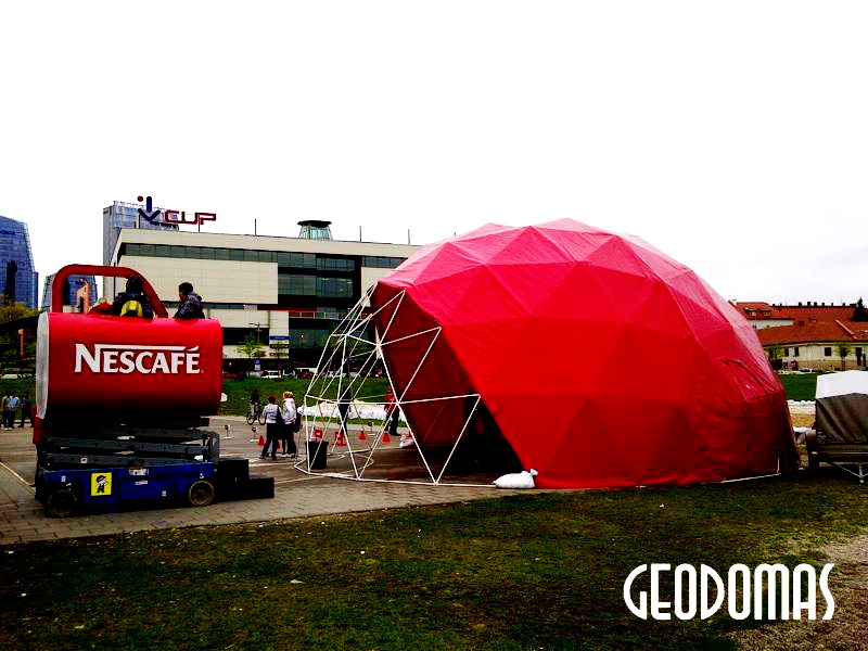 Metalinė, cinkuota sferinės formos konstrukcija | Kupolo formos paviljono rėmas pagamintas iš cinkuoto plieno, vieno varžto jungtys , apatinės jungtys kupolo tvirtinimui.