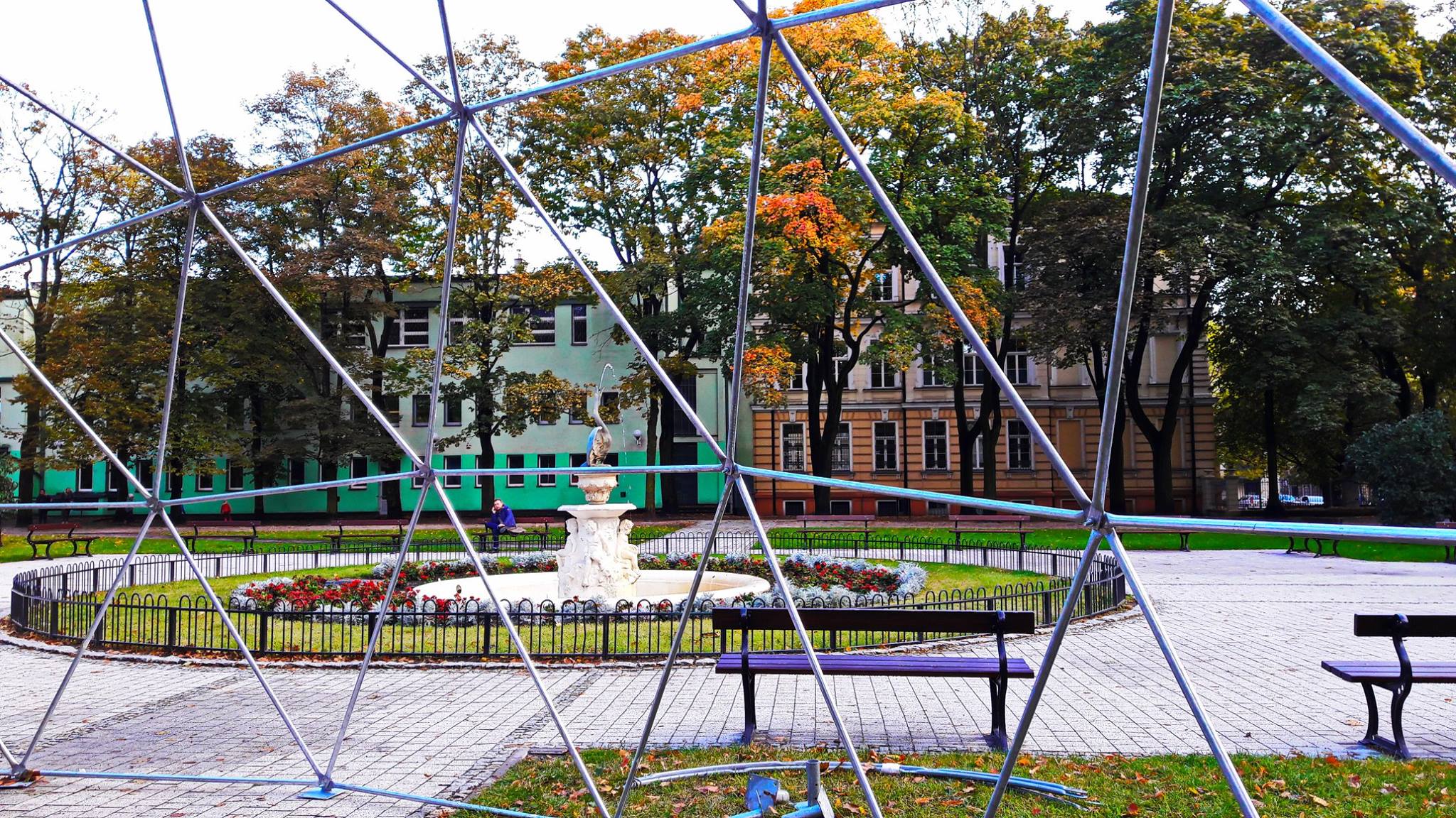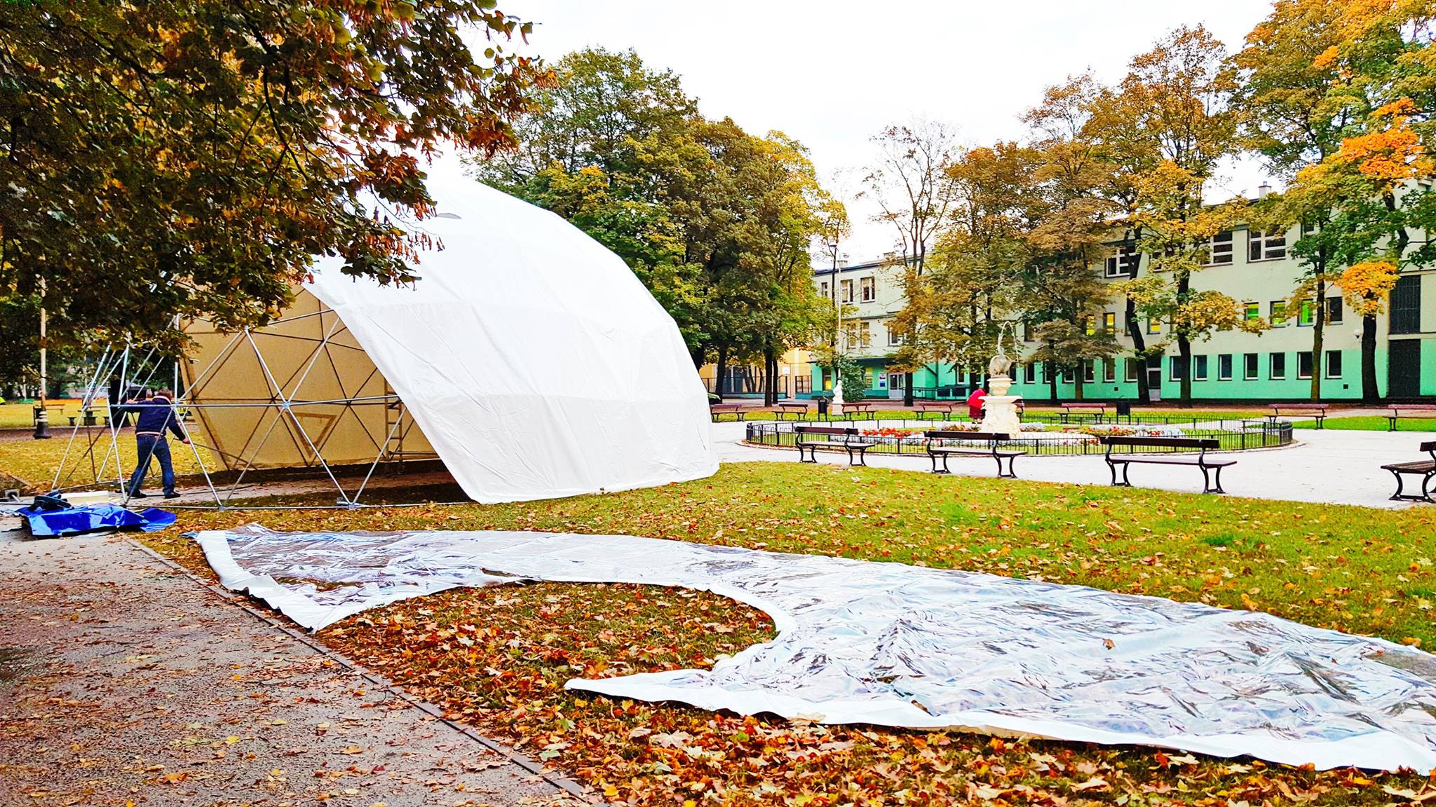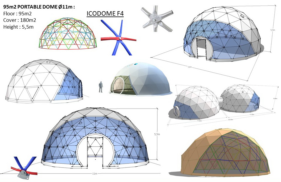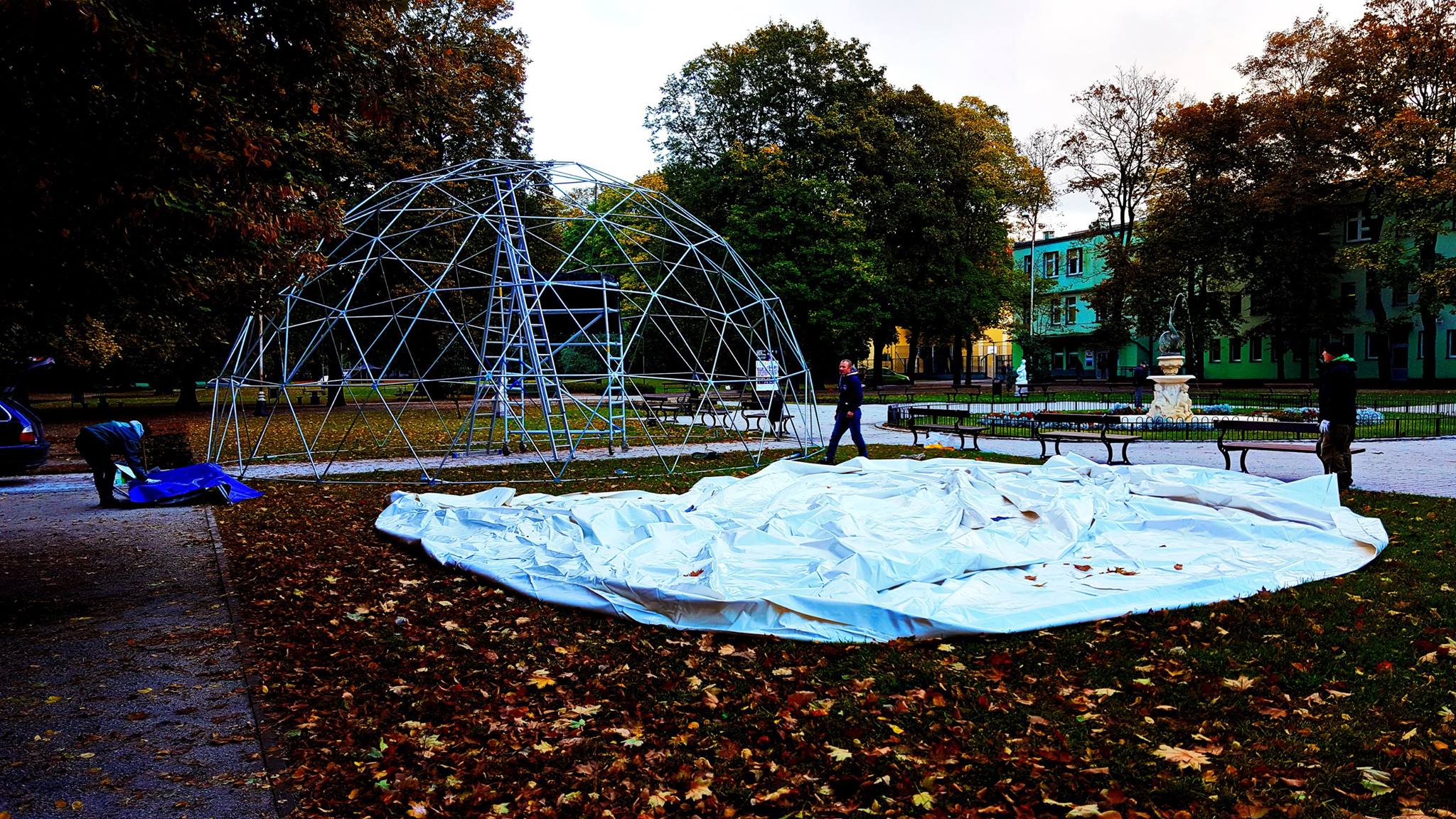 Metalinė, cinkuota sferinės formos konstrukcija | Kupolo formos paviljono rėmas pagamintas iš cinkuoto plieno, vieno varžto jungtys , apatinės jungtys kupolo tvirtinimui.