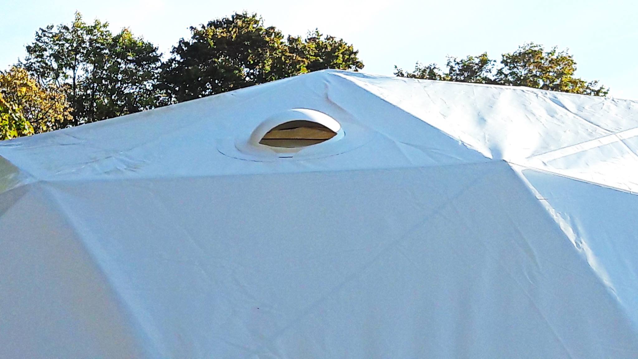 Geodeziniams kupolų uždangalams naudojame aukščiausios kokybės PVC tentų audinius. Visi mūsų audiniai yra sertifikuoti ir atitinka Europos kokybės ir atsparumo ugniai standartus. Nuimama kupolo danga yra žinoma dėl savo privalumų ir ilgo tarnavimo laiko. Dėl dažno audimo medžiaga yra atspari pradūrimams, įbrėžimams ir įpjovimams. Labai lengva išlaikyti kupolo uždangalus švarius. Patvarūs “GEODOMAS” uždangalai yra įvairių spalvų, atsparūs pelėsiui ir apsaugoti nuo UV spindulių ir atsparūs ugniai. Visi audiniai turi ugniai atsparius sertifikatus NFP 92507: M2; DIN 4102: B1; EN 13501-1: B-s2-d0, BS 7837.